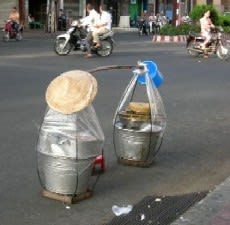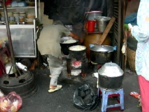 写真左:朝食は屋台で・・の習慣だそうで露地では店が軒を連ねる。炭で炊くご飯屋さん