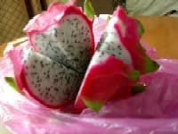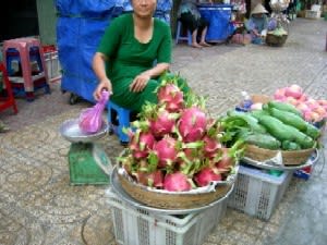 アジアでおなじみのドラゴンフルーツ。この婦人は3種類の商品だけを販売