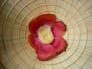 これです。開ききってますが、仏教聖木の一つで平家物語の冒頭の「祇園精舎の鐘の声,諸行無常の響きあり,沙羅双樹の花の色・・・」寺院の庭に落下した花をこっそり持ち出し、笠に入れて撮影したものです。この笠はカンボジアで大活躍します
