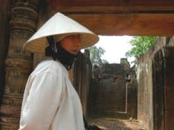 写真左:妙に似合っているベトナムの日よけ笠、雨にも強い・・・たぶん。2$なり