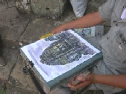 写真右:日陰で絵を描き売る青年。内戦による障害を持つ人は出入り出来営業活動が許可されているという。彼は声を失い筆記だった