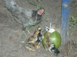 写真右:ココナッツジュースの飲み方を教える親鶏