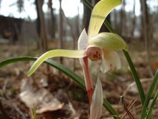 淡黄緑色の花で唇弁は白っぽく赤紫色の斑点が見える(画像は夫から借用)