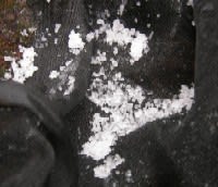 みぞれやあられより角ばった粒子に見えたが、気象用語では直径5ミリ未満が霰(あられ)、5ミリ以上が雹(ひょう)とされているが、計測しなかったので判別できない