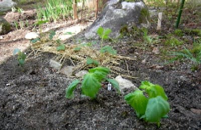 そのまた奥は茶豆の苗2本とエダマメ(奥原という種類)の種の床
