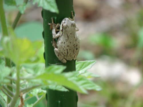 雨続きの毎日はカエルの祝祭日だった。我が家のミニトマトのそばにて