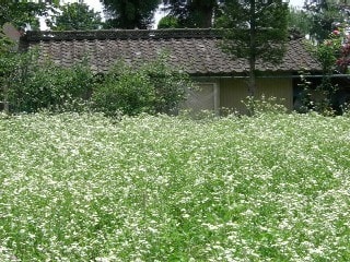 左:古い民家をバックに群生しているとソバに見間違える。そばにはまだ早い