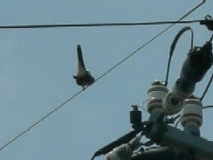 右:見上げると電線の上で尾を立てアクロバット中。啼く時あんな格好をするんだ
