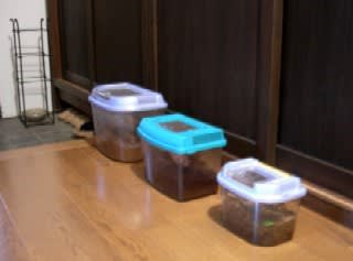こうして飼育ケースは増え、夜中はガサゴソとうるさいので玄関に、昼間は通風のよいリビングにと移動させている。