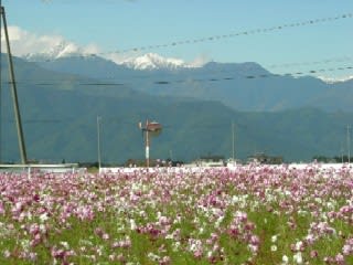 写真が撮りたくてわき道に入ると、突然コスモス畑が飛び込んできた