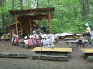 左:シャロム・ヒュッテの森の保育園ではブランコほか用具はそこらの木を使っています
