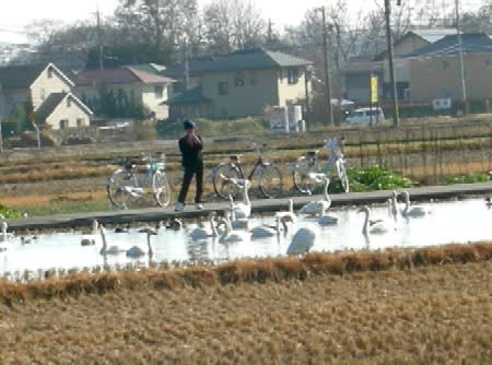 穂高の水田に遊ぶ白鳥は、毎年日中を民家の近くで冬を過ごす