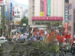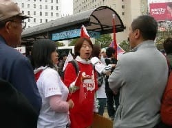 とにかく中国は大量団体戦略である。3~4種類くらいのプリントTシャツを着て、大判の旗を揺らす。おそらく華僑からの資金援助だと思う。