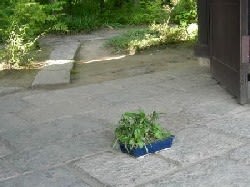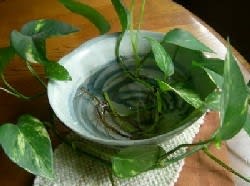 縁がかけた古い中鉢をボンドで接着補修した。しかし食器としては使えないので、食卓のグリーン鉢に変身。