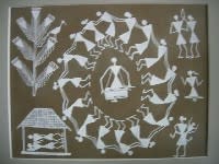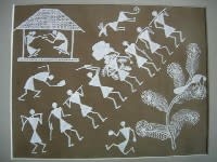 これはワルリー画(サイズ21.5×16センチ)。米汁と先の細い竹で描かれている。