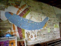先の中越地震による被害で壁が剥げ落ちひびもはいっている。作品のいくつかも破壊されたそうです。