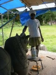 折りしもインド南部・タミールから来日のテラコッタ制作の二人が作業中。