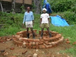 成型した粘土を焼く窯を、レンガで丸く積み上げる。