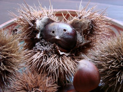 浅鉢に盛った森の恵み—拾った栗が数個—