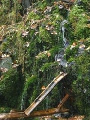 さらに3~4分走ると駐車場(5台)あり。右の山側に、苔むす岩から滲み出した清水がしたたり落ちる