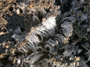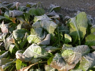 朝8時、野沢菜のそばの霜