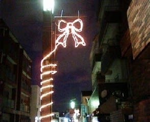 商店街の夕暮れの外灯にリボンが続く。さわやかな印象だった