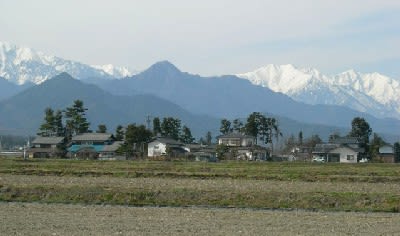 こちらもぼんやり春うらら・・・松川村から眺める爺ケ岳や鹿島槍(右の二山)