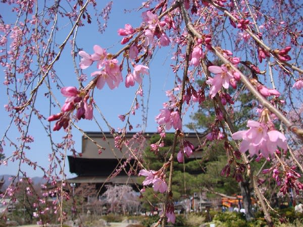 善光寺本堂北側をバックに七分咲きのしだれ桜