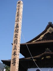 本堂奥深くにご開帳されたその仏像とお柱を結び、お柱(回向柱)に触れることが、前立本尊に触れるのと同じ巧徳を得るという。