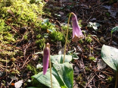 2年前4本購入のカタクリ。今年は細くヒョロヒョロと2本のみ