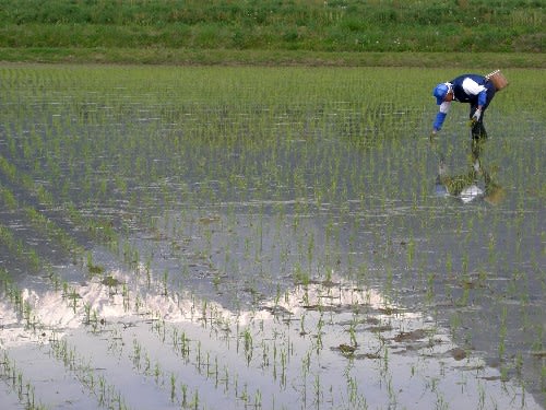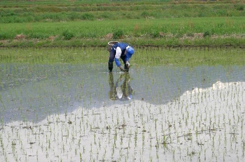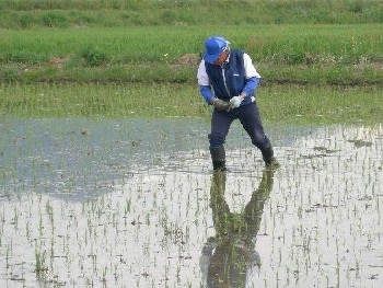 この作業現場は機械で田植えは済んだが、隙間があったり歪んでいたり、雑草を除いたりのアフターケアだとのこと。