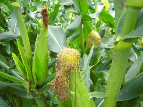 夏日続きのおかげで畑のトウモロコシが太ってきた。