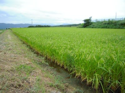 田んぼの水抜きが始まり、そろそろ刈入れ時期だが黄金色にはまだ遠い稲穂。