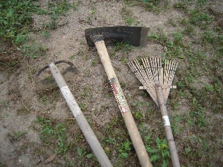 野菜の種類も面積も増え、これじゃイカンと中央の金星印万能鍬が仲間入り。