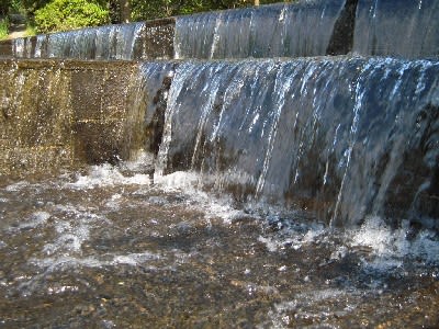 石組みのオブジェに流れる水は、涼しい風を運んでくる