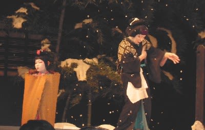 目の不自由な母と、母を助けるけなげな娘・・・の場面。1.5センチ角くらいの白い和紙の雪が降る