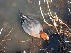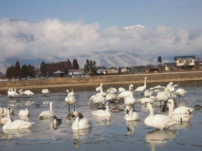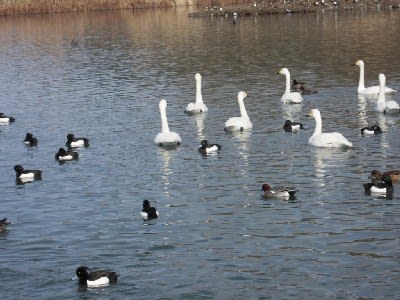 御宝田のコハクチョウを表敬訪問。パンダ柄のカモは「キンクロハジロ」