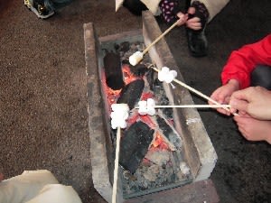 別棟では焼きマシュマロ。さっと炙るとヌガーのようになる。空いているせいか、いくつでも食べてと客を呼ぶ声
