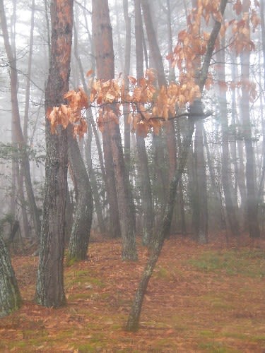 目覚めると林は深い霧だった——–まもなく晴れて今は晴天