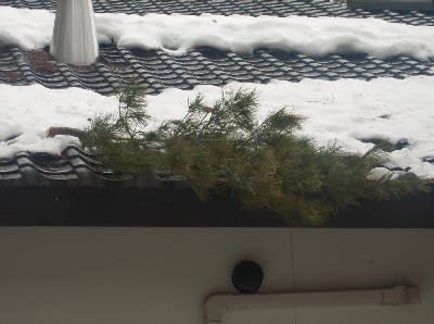 過日の大風で松の枝が屋根を直撃。幸い瓦が割れたりヒビは入らなかった