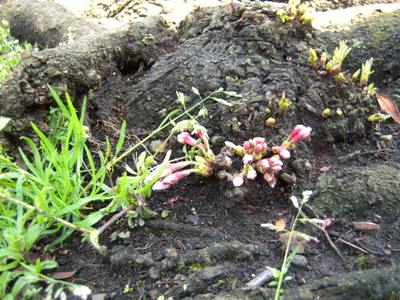 地面を這う太い根だか茎から芽を出していた。もうすっかり咲き切っただろう