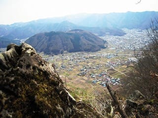 ほぼ頂上近くに松代の町が見える立見岩(左の三角岩)