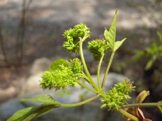 左:アオダモ(バットノキ)・・・白いブラシのような花だが、今年も咲くかな
