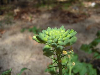 砂地に保存していた大根の残骸が、葉を茂らせ花を咲かせようとしている