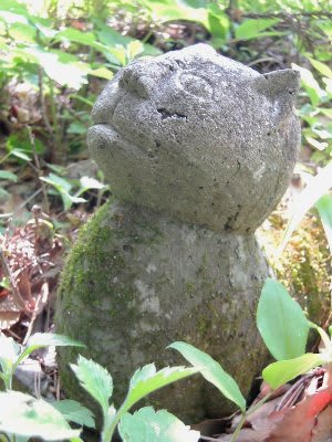 居並ぶ古ぼけた石像(修那羅仏)のなかに、何故か天を見上げる猫像