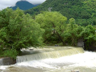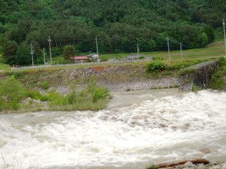 続く大雨で、中房川は台風並みの増水量で里へ流れる