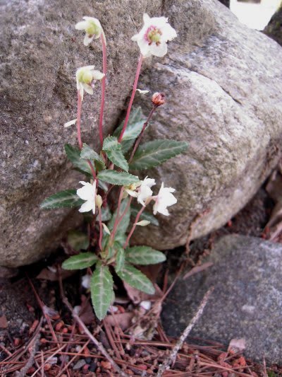 ウメガサソウとちがって花の色はピンク色で、数個の花が散房状につくので、