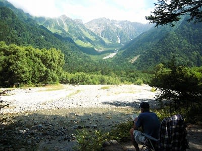 キャンプ場の人だろうか?椅子を持ち出し梓川のほとりで緑陰読書中。