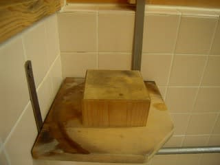 共同浴場の洗い場は狭い。共同浴場「新湯」にあった、桶を被せて載せる台。