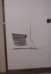 写真左:ふすま 高級縦じま模様と迷ったあげく予算内に落ち着いた墨絵の抽象画